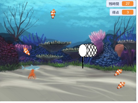 前月に作った射撃ゲームを改造し、新たなゲームを作ってくれました。泳いでくる魚によって、動きも異なり、取った時の得点も変わります。